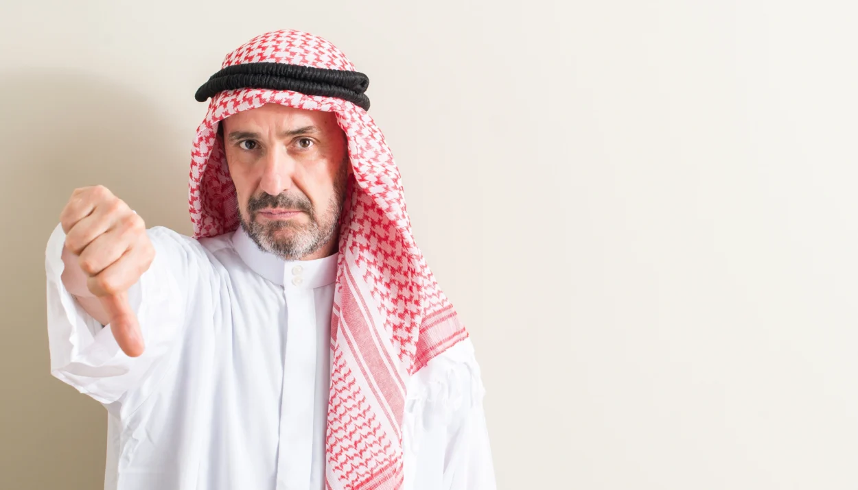 Foto: Mann mit wütendem Gesicht, Abneigung mit Daumen nach unten zeigend. – AaronAmat / iStock by GettyImages