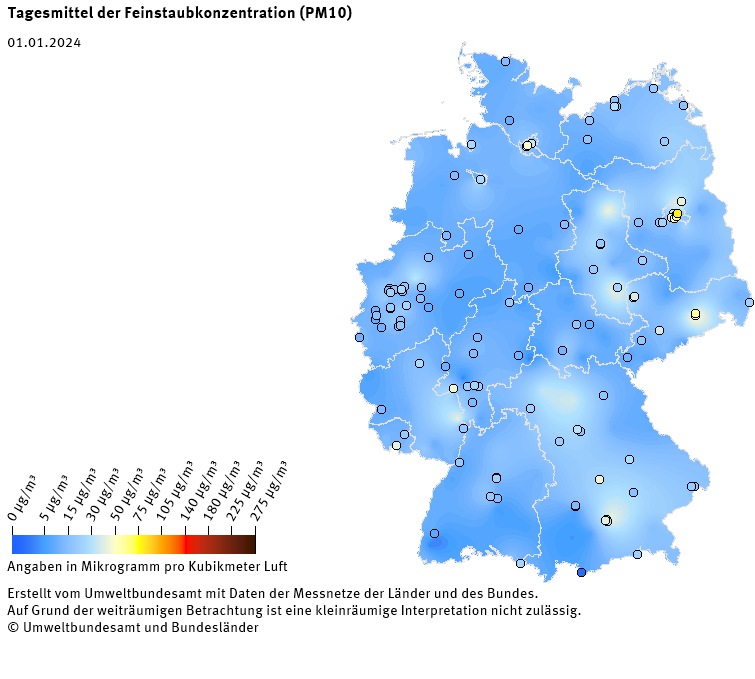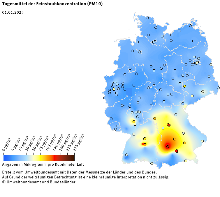 En Alemania, sólo los fuegos artificiales liberan cada año unas 2.050 toneladas de partículas (PM10), la mayoría de ellas en unas pocas horas alrededor de la medianoche.33 Agencia Federal de Medio Ambiente: 2.050 toneladas de partículas procedentes de fuegos artificiales al año 🌐.https://www.umweltbundesamt.de/presse/pressemitteilungen/2050-tonnen-feinstaub-durch-feuerwerk-pro-jahr En muchas ciudades, los niveles de partículas se disparan a más de 1.000 microgramos por metro cúbico en Nochevieja, mientras que el valor medio anual es de unos 15 microgramos.34 Tagesschau Faktenfinder: De las lesiones a las partículas: ¿cuáles son las consecuencias de los fuegos artificiales? 🌐 https://www.tagesschau.de/faktenfinder/kontext/silvester-boellern-auswirkungen-102.html
