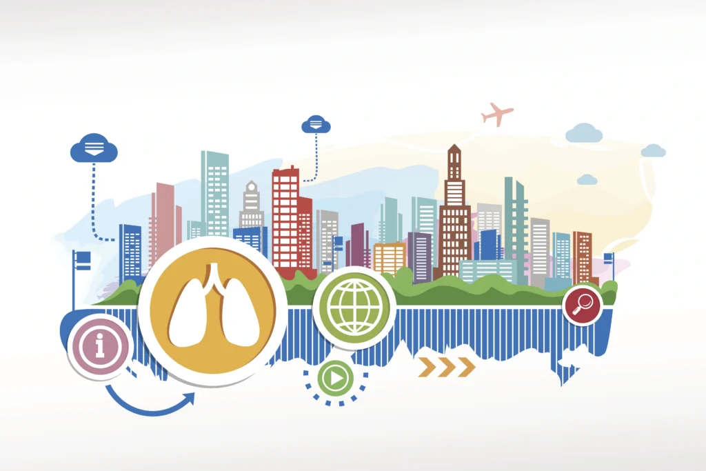 Abbildung: Lungen-Schild und Stadtlandschaft, Illustration – VMasterArt / iStock by GettyImages